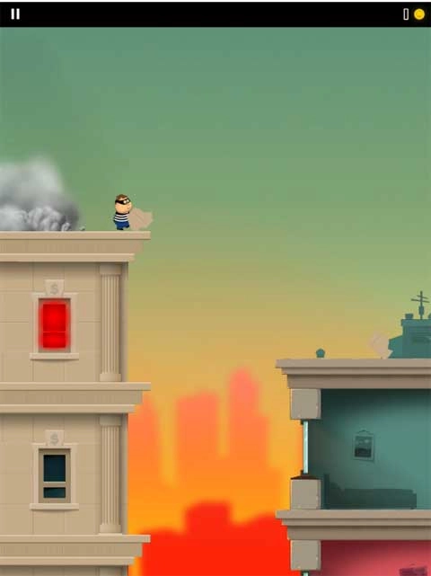 1、游戏一开局,胖胖的老爸就穿着小偷的服装,从一座高楼大厦里蹦出来,跳到了另一座城市。