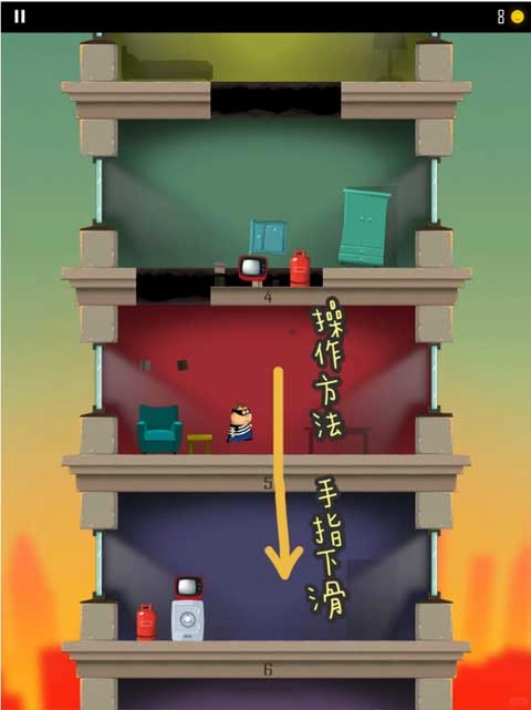 2、操作方式为用手指在屏幕上上下滑动,角色会以蹦跳的动作冲破当前楼层,以此抵达下一层。