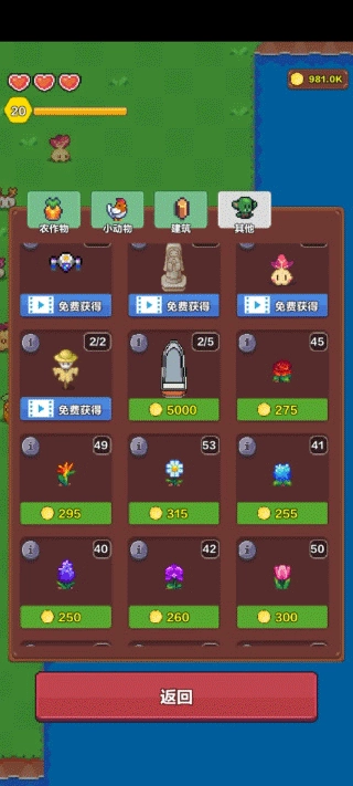 1、上线后先找到界面下方第三个钻石图标的入口,进入后把“其他”分类下的三个广告任务都完成:a是精灵(可当“苦力”使用),b是飞行器(功能是只拾取掉落的物品),c是神像(只要解锁新物种就立刻凑钱把它放置出来)。这三个里面精灵是最重要的,它既能种地、浇水,还能一次性拾取5个物品;相比之下,飞行器一次只能捡一个。