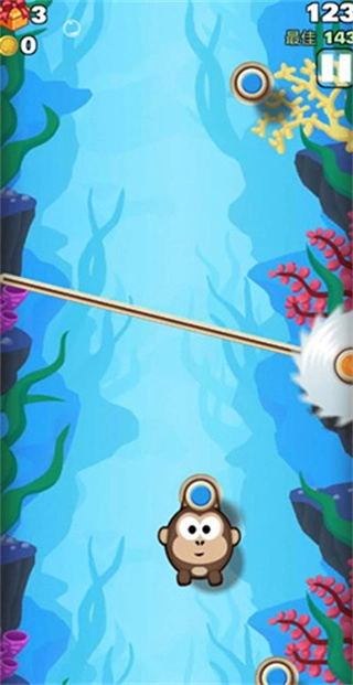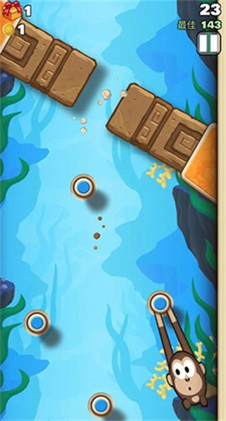 1、在本站安装后点击打开进入游戏,其实《弹射金刚》的玩法非常简单:游戏开始时,一只猴子会吊挂在一个木桩上,你需要调整合适的弹射方向,让猴子能吊挂到其他木桩上。不过在弹射过程中,要时刻小心那些忽隐忽现的障碍,比如食人花、移动锯子等等。总而言之,只要坚持不断向上的原则就可以了。