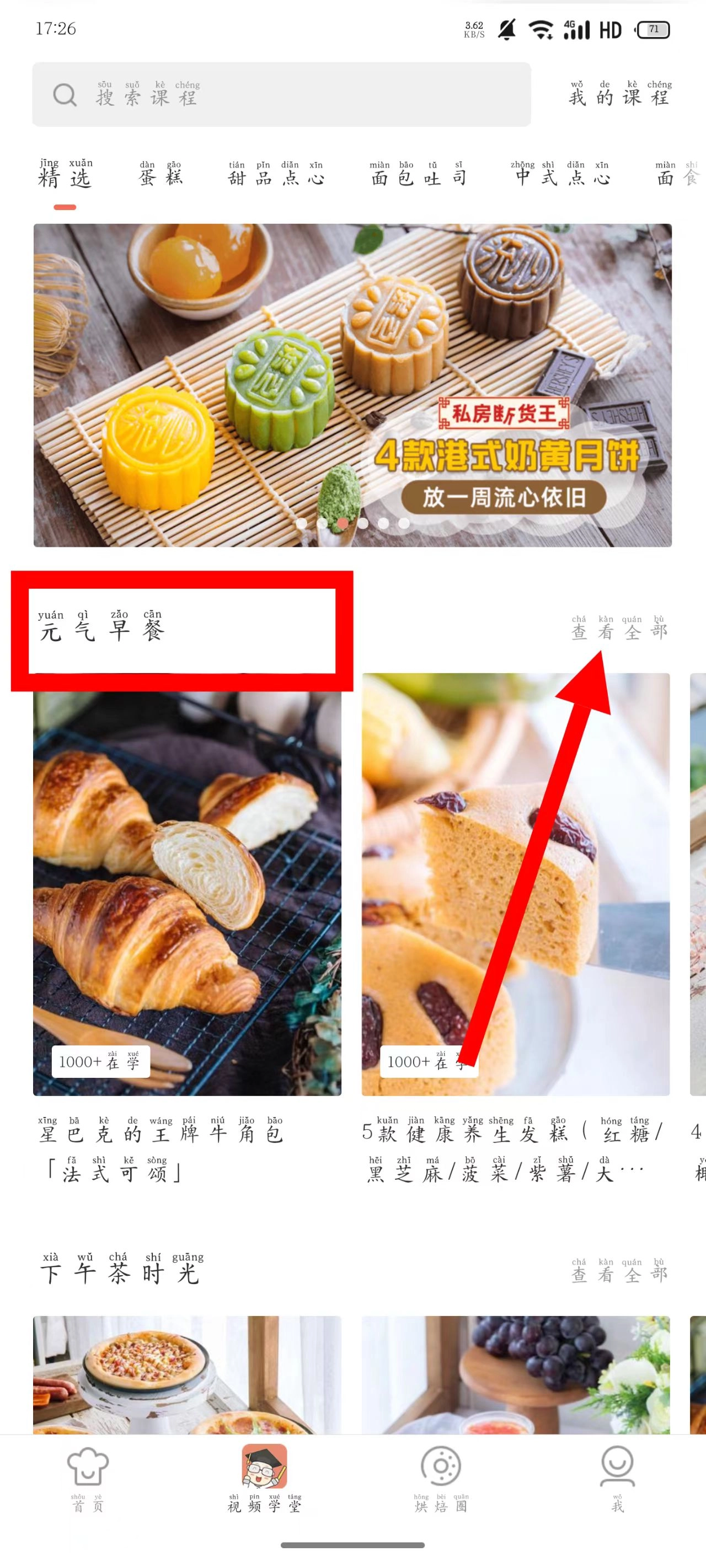 在视频学堂页面,找到元气早餐板块,点击查看全部按钮。