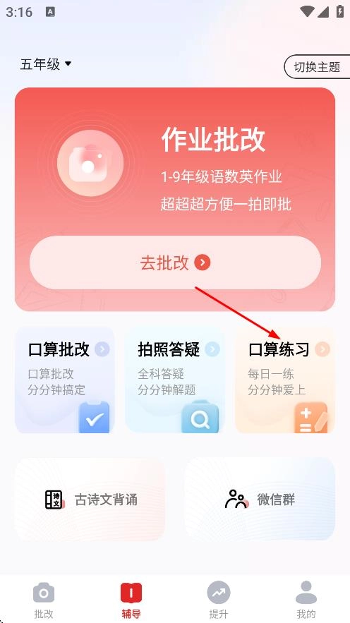 在辅导页面,点击口算练习,进入口算练习选择页面。
