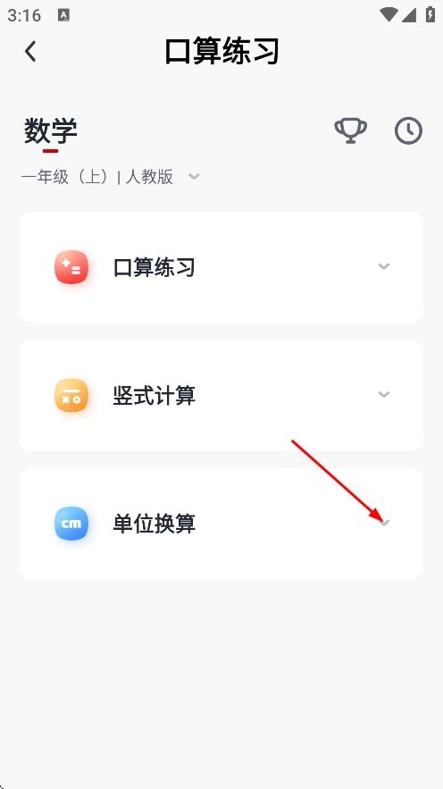 在练习选择页面,点击单位换算选项旁的区域,展开单位换算的练习内容。