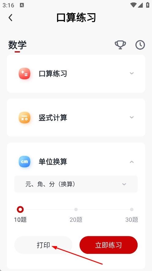 在展开的单位换算练习内容里,点击打印按钮,就能进入打印页面。