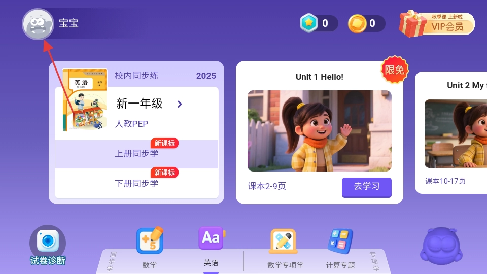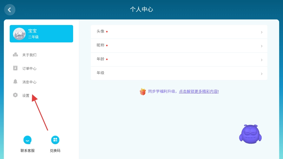 在精灵学伴首页,点击左上角的头像,进入个人中心页面。