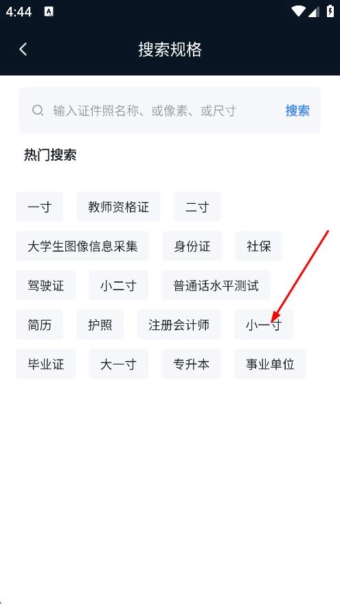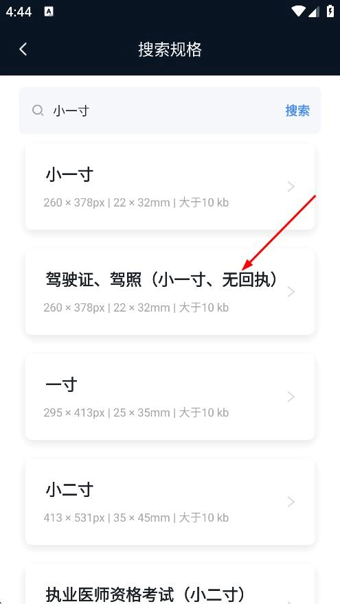 在搜索规格页面,点击小一寸,查看相关证件照规格。
