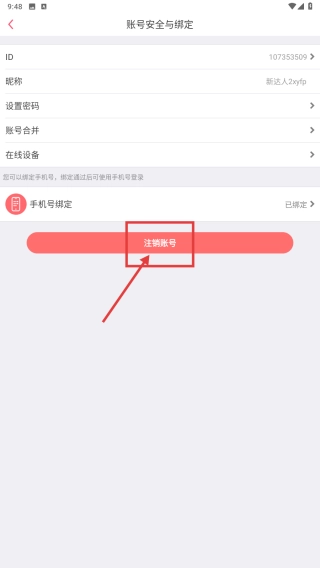 在账号安全与绑定页面,找到并点击注销账号按钮,即可执行账号注销操作。
