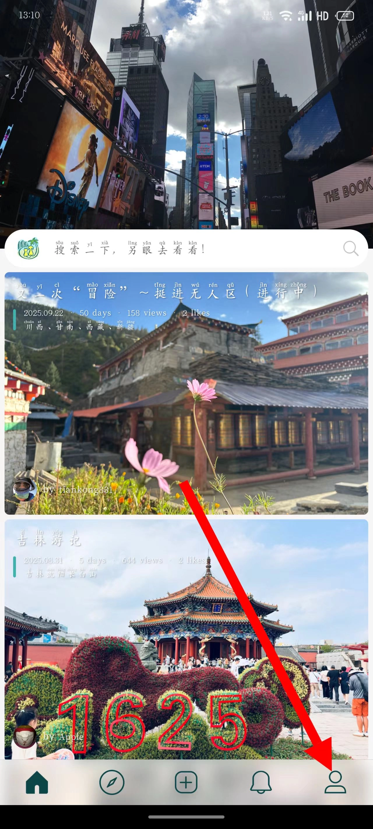 1、打开去看看旅行,点击右下角人形图标。