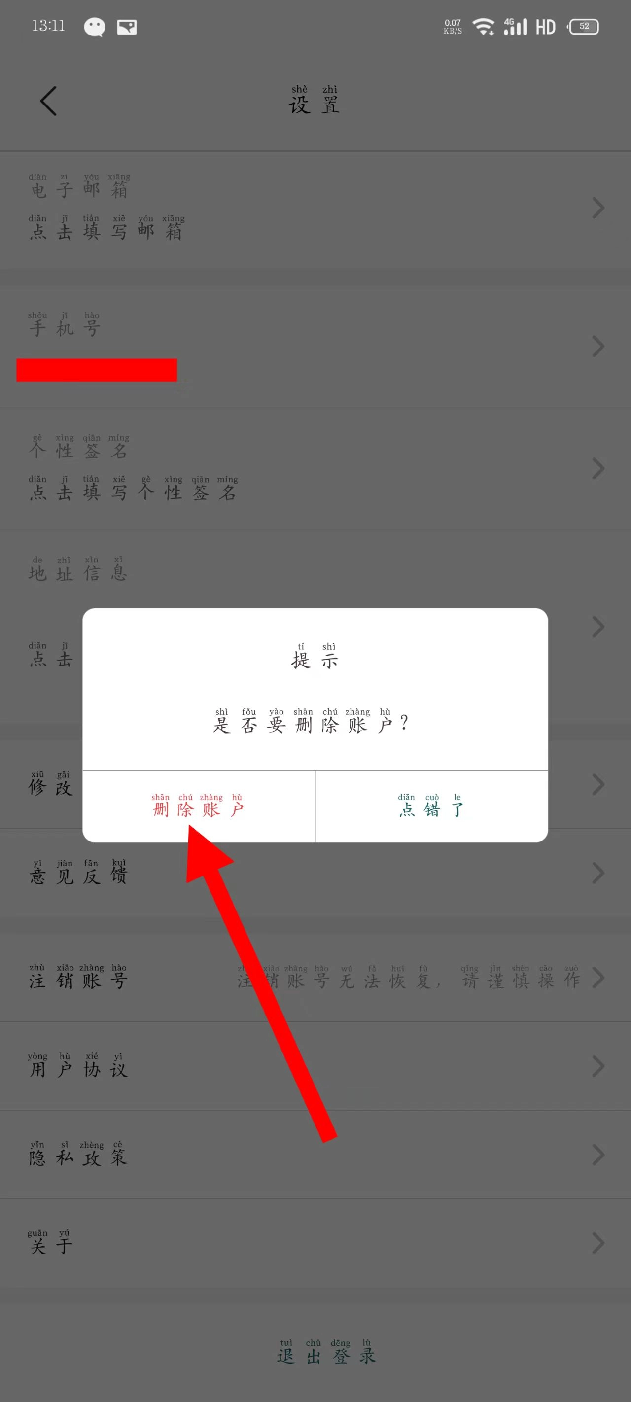 4、在弹出的提示框中,点击删除账户。