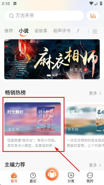 1、搜索查找内容:启动软件后,点击顶部的搜索框,输入书名、作者名或者相关关键词,就能迅速定位到对应的有声小说,点击该小说就能开始播放,便捷获取自己喜欢的内容。