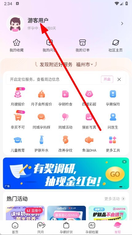 2. 在发现页面当中,点击游客用户的头像。