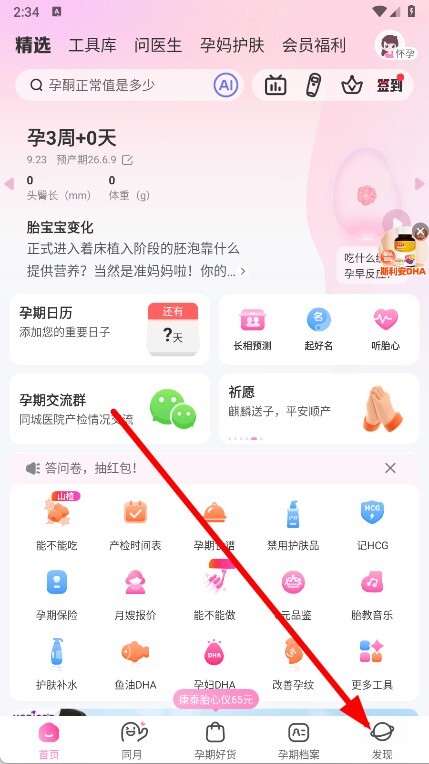 1. 开启妈妈网孕育应用,轻点底部的“发现”选项。