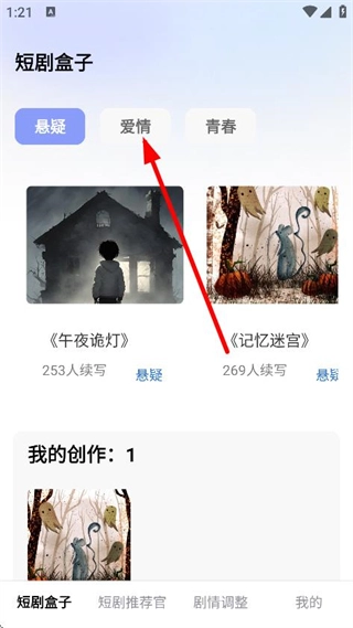 在短剧盒子页面,点击爱情标签,切换到爱情类短剧列表。