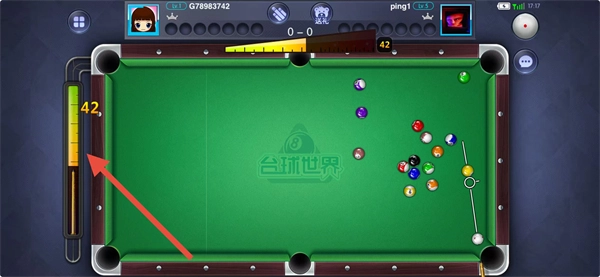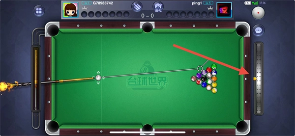 进入对局后,你可以通过滑动右侧的标尺来调整击球的力度,这个力度的大小会直接影响到击球后的速度,以及目标球最终的移动距离,所以需要根据目标球和袋口之间的距离来进行合理的调整。