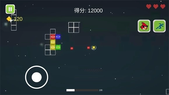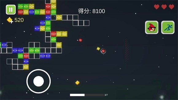 4、玩家的血量会显示在屏幕右上角,每次碰到方块都会损失一颗心,操作时需要多加小心。