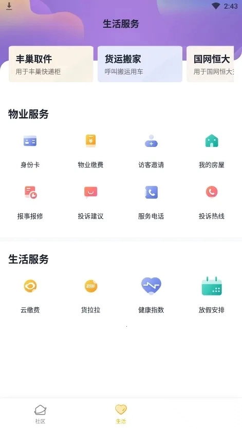 4、生活超便利:包含丰巢取件、扫码充电、货运搬家、邻里社交圈等服务,打造15分钟生活圈。