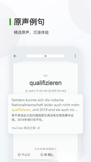 收录《每日德语听力》中的海量原声例句,内容出自你喜欢的电影、剧集,或是DW、Tagesschau、Deutschlandfunk、Logo等专业新闻,助你了解单词的真实单词语境,专业高效地记忆单词。