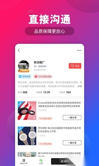 这是一款面向微商、代购等社交电商从业者的货源服务工具,主要功能包括货源查找、分销合作、商品分享以及高效的转发铺货展示。同时,平台还提供一件代发、7天无理由退换货、快速发货等配套服务支持。