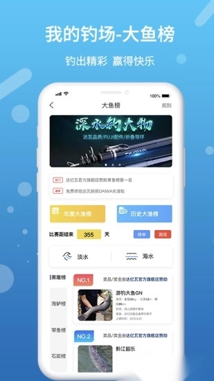 ● 大鱼榜单:各位垂钓高手们,快来展示你钓获的大鱼吧!无论是年度大鱼榜还是历史大鱼榜,都期待你的参与,更有丰厚奖励等着你来挑战赢取!
