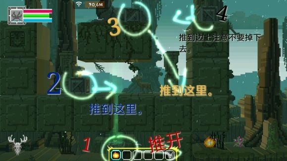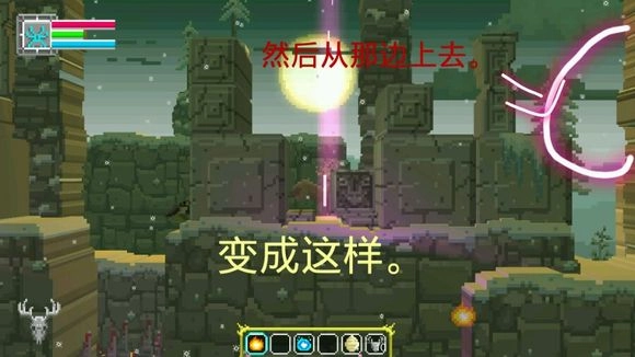 第三个是生长。实际上,只要推动中间那块石块,再跳上长出来的藤蔓就行。