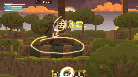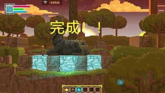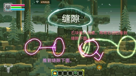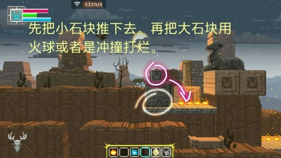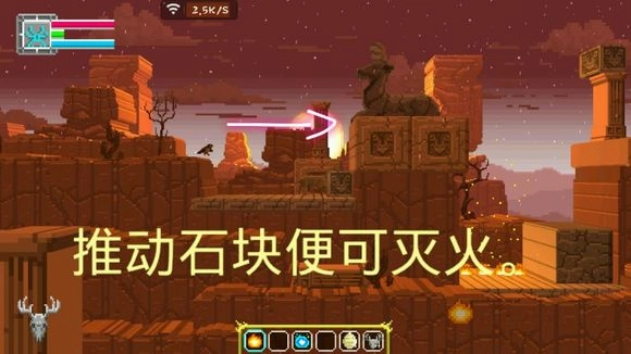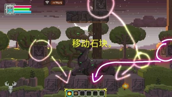游戏开始时,左侧山上有复活石,学会二次跳跃后就能跳上去拾取。点击红条左边的经验框可以打开物品栏,把2个复活石拖到使用栏,退出物品栏后,选中复活石并点击屏幕右侧的透明图标就能使用了。