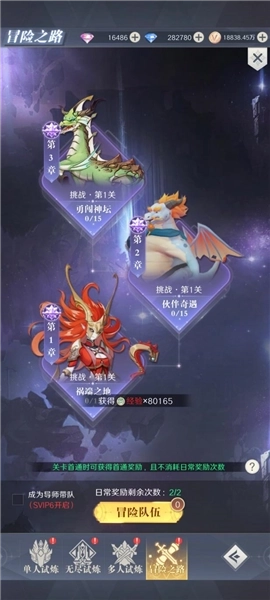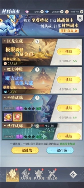 闯关扫荡:左下角自动闯关,每日可以快速扫荡三次,根据SVIP等级可以额外购买次数,每日凌晨五点刷新次数。层数越高,快速作战获取的经验越高。(经验副本和快速作战都是每日凌晨五点刷新次数。熬夜的小伙伴可以每天十二点之后先充值提升一下战力,然后再去打,这样可以最大化经验收益!)