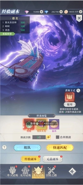 经验副本:每天两次,根据SVIP等级可以额外购买次数,副本根据打怪的波数结算经验,尤其是开服第一天,先不要着急单人自动匹配打副本,先提升战力,频道邀请其他玩家一起刷副本,建议找比自己战力高的或战力相近的组队,找服务器大佬带刷是最靠谱的,划重点可以跨服组队,千万不要自动匹配,每日凌晨五点刷新次数。