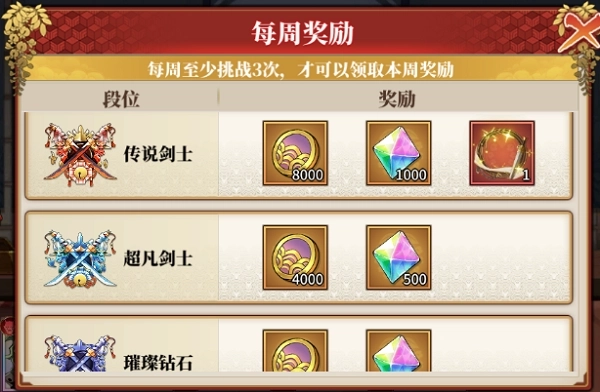 2、每周奖励属于循环发放的奖励类型,当新赛季开启且段位完成重置时,在上一赛季中参与过3次及以上挑战的玩家,能够在该玩法的界面中领取此奖励。