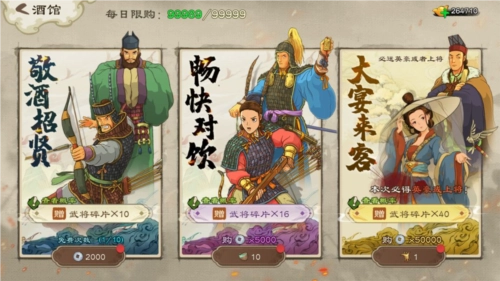 酒馆位于封地之内,是一处供人饮茶品茗、结交朋友的地方。许多武将豪杰都喜欢把这里当作休憩之所,馆内氛围和睦,茶香弥漫,时常有豪爽之士在此大宴宾客,堪称封地中最热闹的去处。而在游戏里,它的作用是帮助玩家获取武将碎片,进而招募武将。