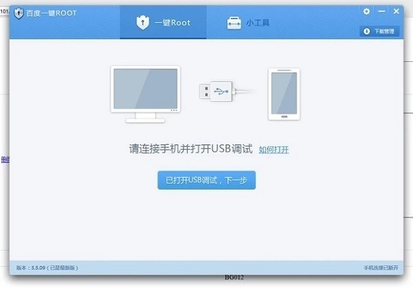 3、在Android手机上安装“百度一键Root”。第一步,使用数据线将手机连接至电脑的USB接口,接着依照图示开启手机的“USB调试”功能,此外还要安装手机USB驱动。