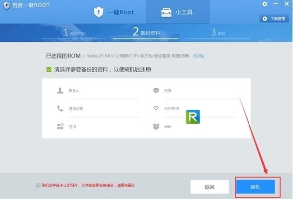 6、点击后,手机操作系统将自动运行,完成后会提示进行数据备份,选择需备份的数据,接着点击刷机以解除权限。