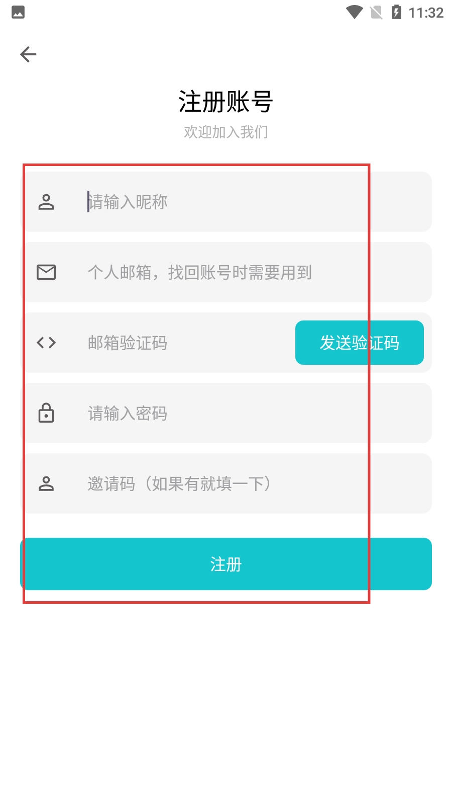 4、在账号注册界面,按顺序填写昵称、个人邮箱、邮箱验证码、密码等信息,即可完成注册流程。