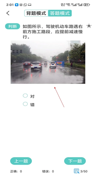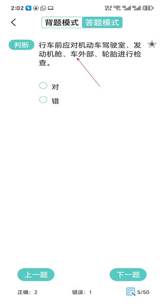 4、进入下一题页面后,题目内容围绕行车前的车辆检查展开,在选择“对”或“错”的选项后,点击下一题按钮继续完成后续答题流程。