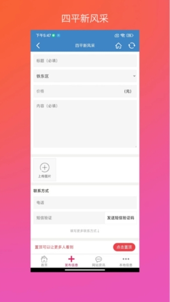 开启四平新风貌,在页面底部找到「发布信息」按钮,挑选相应分类,即可发布信息。