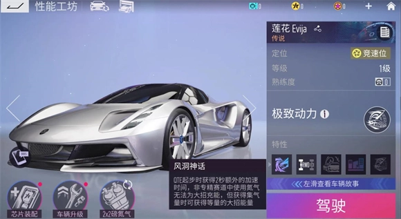莲花 Evjia(T0级别)的大招效果为:开启后以50km/h的速度加速推进,持续6秒;在此期间,每使用一次氮气,可获得2秒隐身效果,同时大招持续时间延长1.2秒,且大招推进速度额外提升8km/h(该速度加成上限为40km/h)。其被动特性包括:起步加速的持续时间增加2秒;在非专精赛道中,氮气无法为大招充能,但集气过程中会同步积累大招能量。