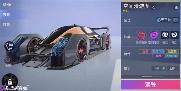 空间漫游虎,T1级赛车。开启大招后,会在前方50米处生成持续4秒的空间漩涡,自身穿过漩涡可向前闪现,最远可达70米。队友穿过该漩涡后,6秒内首次使用氮气时,将触发30米的闪现效果;敌方车辆穿过漩涡后,6秒内首次使用氮气时,则会强制后退30米,且此效果无法被净化。其SP技能为:向前闪现至最近的车辆位置,闪现距离上限60米、下限10米,冷却时间25秒。被动效果是:当场上有其他车辆进行闪现操作时,自身下一次释放大招的闪现距离将额外增加30米。