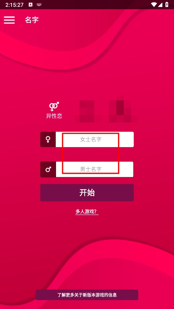 用户先进行安装操作,完成后进入界面,接着输入男士与女士的名字,最后点击“开始”按钮。