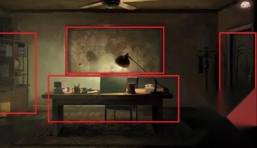 画面里有四个关键元素,分别是左侧的书架、书桌、后方的世界地图和右侧的门。我们先与书桌进行交互,进入桌面界面后打开抽屉。