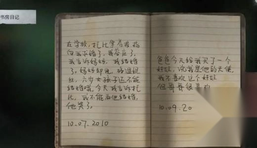 左边抽屉里放着一个小盒子,要打开它得用类似手机锁屏密码的图案才行。右边抽屉内有一本日记和一把螺丝刀,翻开日记阅读后,能看到里面的内容(如附图所示),同时还能拿到那把螺丝刀。桌面左侧的台灯下面压着一张合照。笔记本电脑因为缺了些按键,现在还没法进行操作。