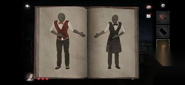 5、吧台处摆放着菜单。需要在每张桌子间走动查看,以此获取刀叉。让小男孩和吧台的男人这三个人点好餐食(肉汤放在另一张桌子上,假人喝完后会趴倒,其手上会出现嘴唇印记)。