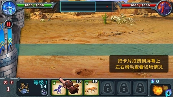 3、把卡片拖拽到屏幕上开始战斗,左右滑动可以查看战场情况。