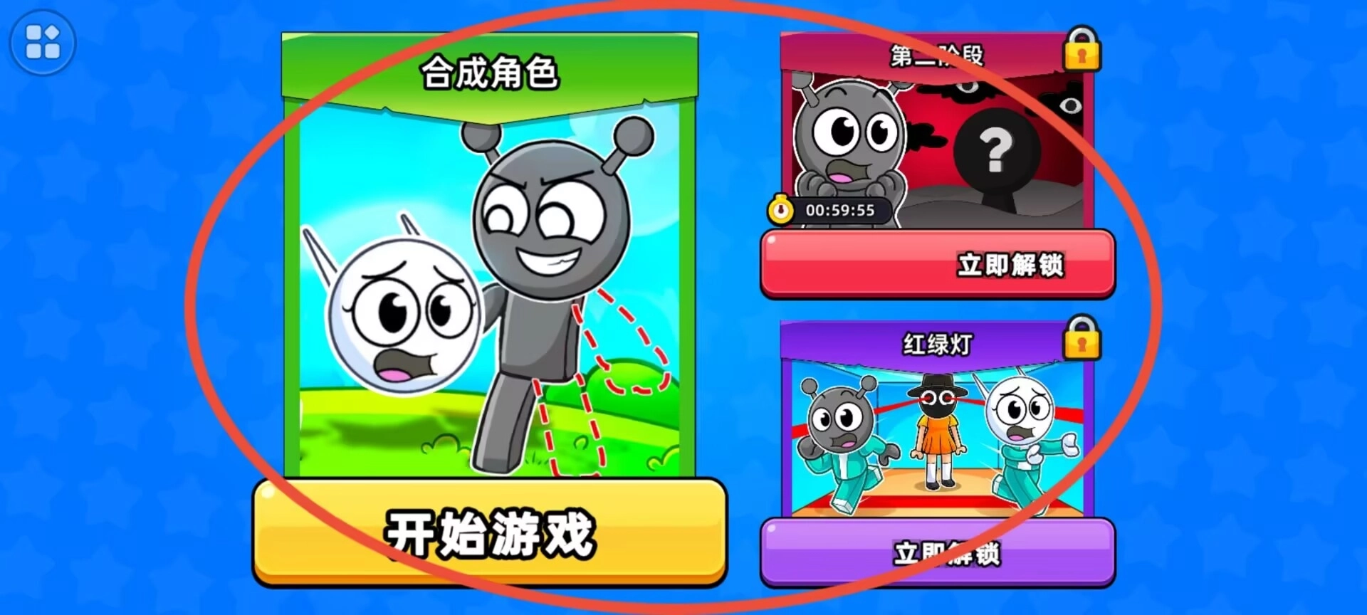 1、游戏开局设有三种模式可供选择,其中两个模式需要满足特定条件才能解锁,而基础模式则包含角色合成的玩法。