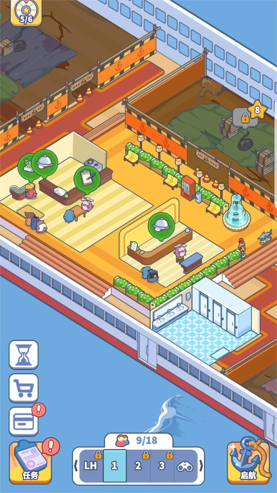 2、多样的经营玩法:玩家需打造并升级游轮上的餐厅、客房、娱乐场所、商铺等区域,满足游客的各类需求,凭借提供贴心的服务来招揽更多客人。