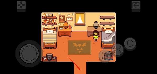4、紧接着便正式开启游戏。此时,托丽尔呼喊着克里斯(Kris)的名字,提醒他上学别迟到了。(按下“乙”键进入下一步)玩家需操控Kris起床,然后出门前往学校。滑动左侧的控件,让Kris朝着箭头所指的方向走去,随后便会切换至下一个场景。