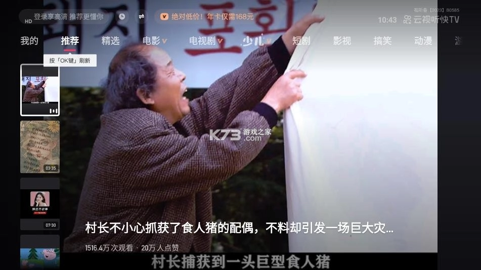 云视听快TV的功能远不止刷短视频。它设有动漫、美食、游戏等多个内容专区,能满足不同年龄与喜好的用户需求。该软件具备智能推荐功能,会依据你的喜好推送内容,而且还支持登录后同步收藏和历史记录,让你在大屏设备上也能畅享个性化的观影服务。