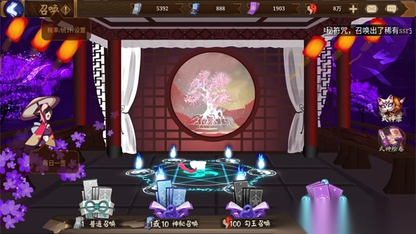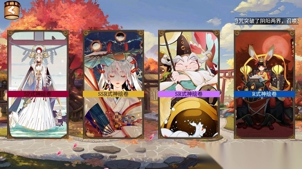 2、进入画面后,系统会赠送大量资源。玩家能够通过普通召唤、神秘召唤、勾玉召唤以及现世召唤这四种抽卡模式抽取式神。式神按SP、SSR、SR、R划分不同品质,随着召唤的升级,品质依次提升。