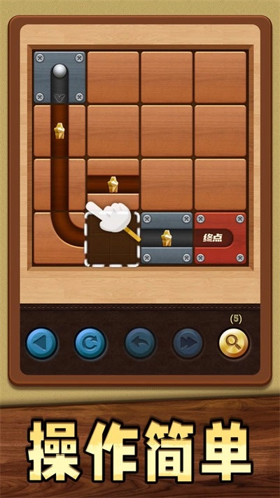 3、操控木质方块拼接路径,引导球球到终点,右下角按钮辅助通关。