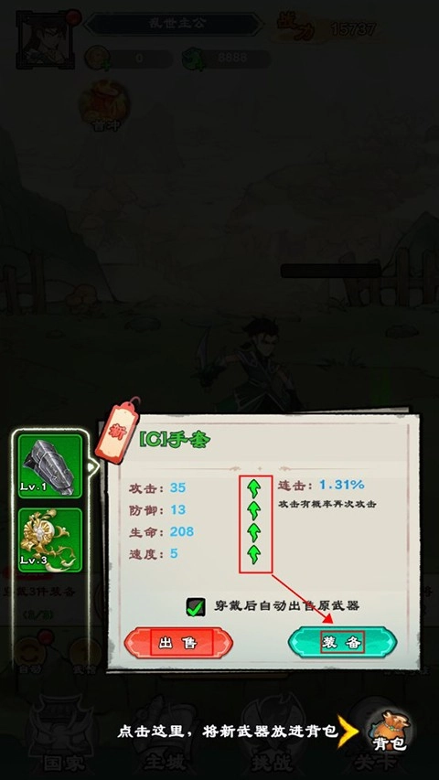 3、成功击败敌人便能获取装备奖励,玩家可依据自身战力的变化,决定是出售装备还是穿戴。
