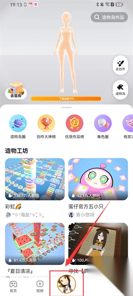 4、紧接着点击下方的人物头像栏目,这里为大家带来了造物岛功能。在该功能下,用户能够自由地为角色进行捏脸、换装,还可以进行地图创作等操作,自由度极高。不仅如此,用户还能邀请好友一同前来玩耍哦!