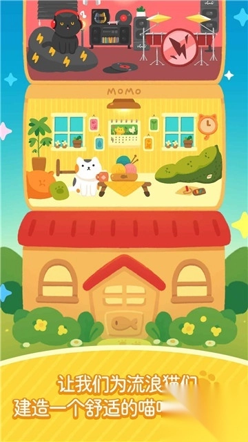 1. 以低多边形彩绘风格搭建沉浸式喵星家园,融入猫咪呼噜音效与踩奶动画,塑造随时能踏入的减压空间。